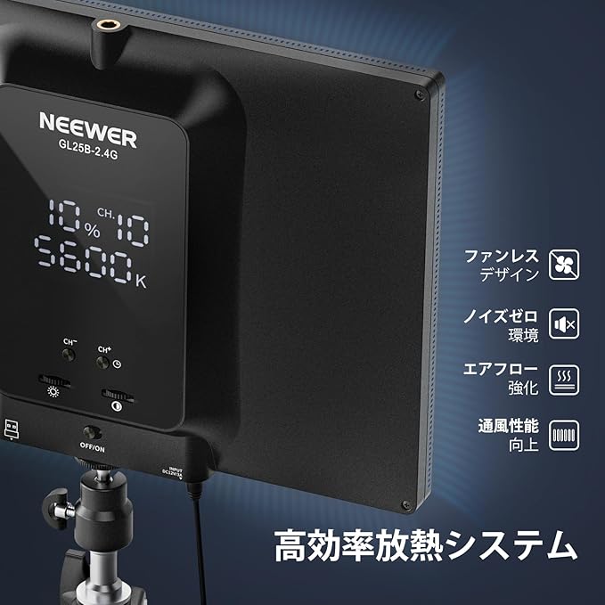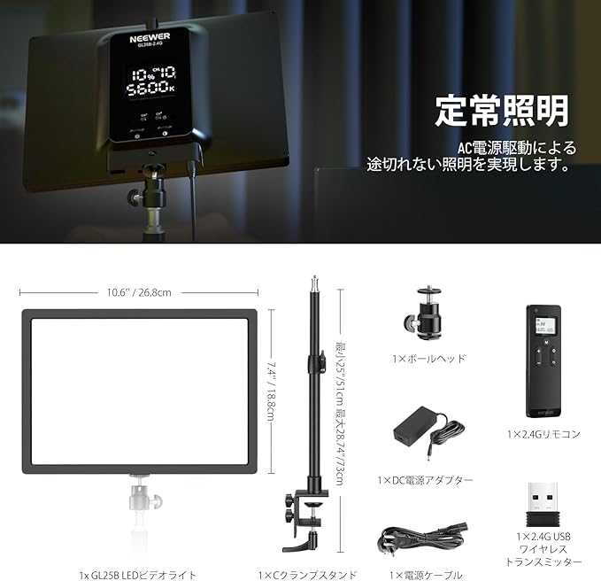 【セット内容&安心.】1x GL25B LEDビデオライト、1x Cクランプスタンド、1x ボールヘッド、1x DC電源アダプター、1x 電源ケーブル、1x 2.4Gリモコン、1x 2.4G USB無線送信機。日本語取扱説明書も同梱していますので、ご安心ください。また、ご使用中何かご質問がございましたら、お気軽に.のカスタマーサポートまでお問い合わせください。