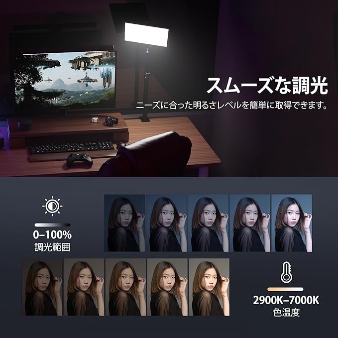 【超演色性&調光可能】LED撮影ライトは2900K-7000K広域色温度調整と0-100%調光機能を搭載し、自然光から暖色までシーンに合わせた光色を再現します。超高演色性(CRI98+)は肌の質感や商品の色味を正確に明らかにし、生放送、eコマース撮影、ポートレート撮影などに最適です。
