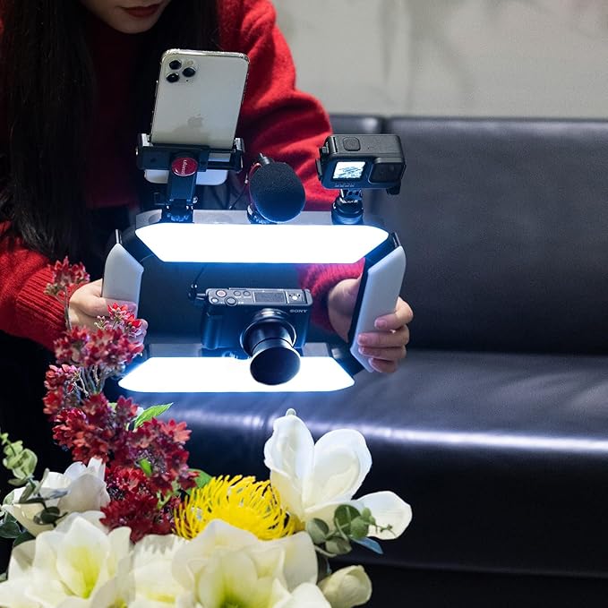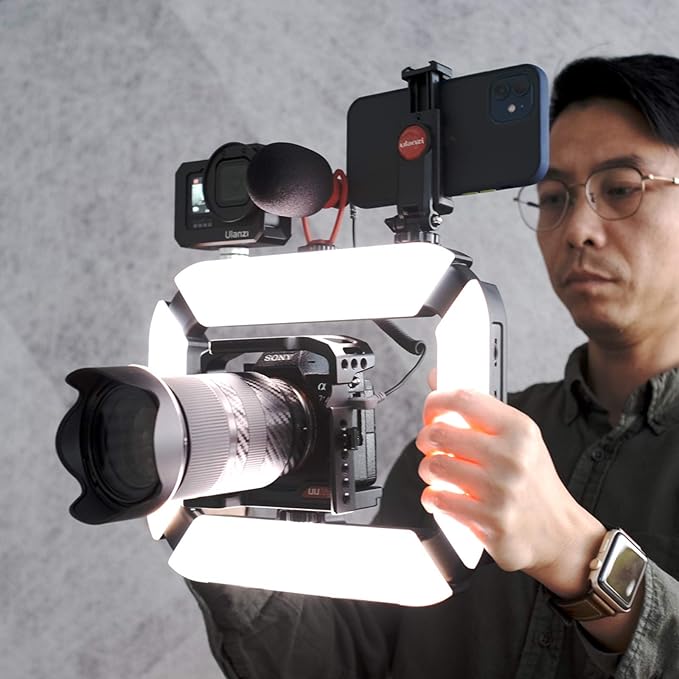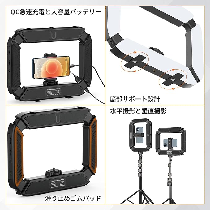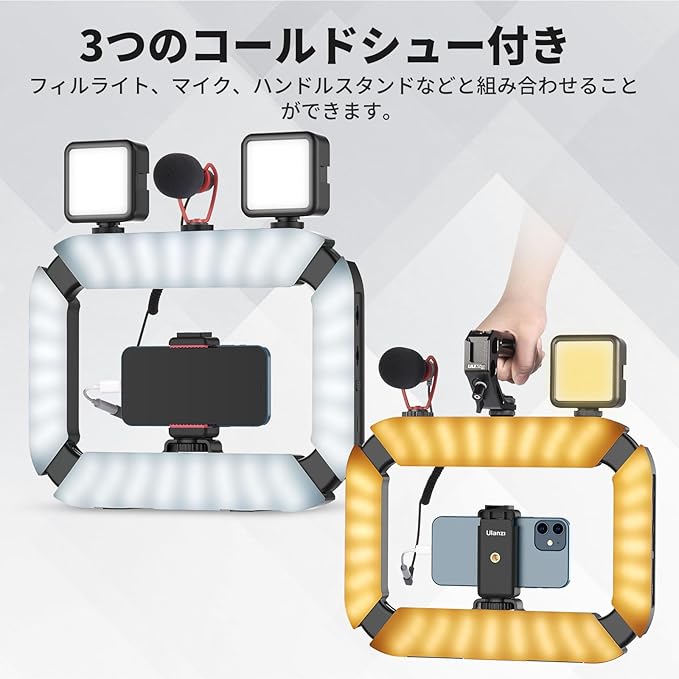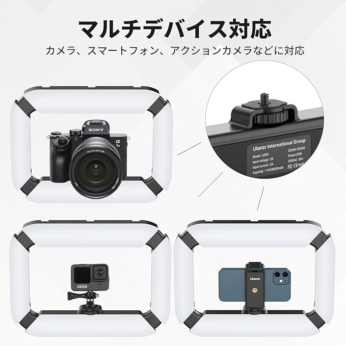 【マルチデバイス対応&豊富な拡張性】U200撮影ライトは、底部の1/4"-20スレッドがあり、カメラ、スマートフォン、アクションカメラなどに対応しています。三脚に取り付けて撮影も可能です。底面サポート設計により、立てて使用でき、横置きと縦置きの撮影に対応しています。4面デザインは手で持ちやすい。また、上部には3つのコールドシューマウントがあり、ライト、マイク、スマホホルダーなどを取り付けることができます。
