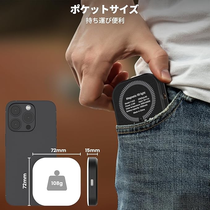 【超軽量・ポケットサイズ】 サイズはわずか7.2 7.2 1.5cm、重さ約108g、手のひらサイズで持ち運びやすい。 リングライト スマホ用として、自撮りライト・物撮り照明・配信ライト・Web会議ライトなど、1台で多機能!SNS投稿、Instagram映え、YouTube撮影にも大活躍。