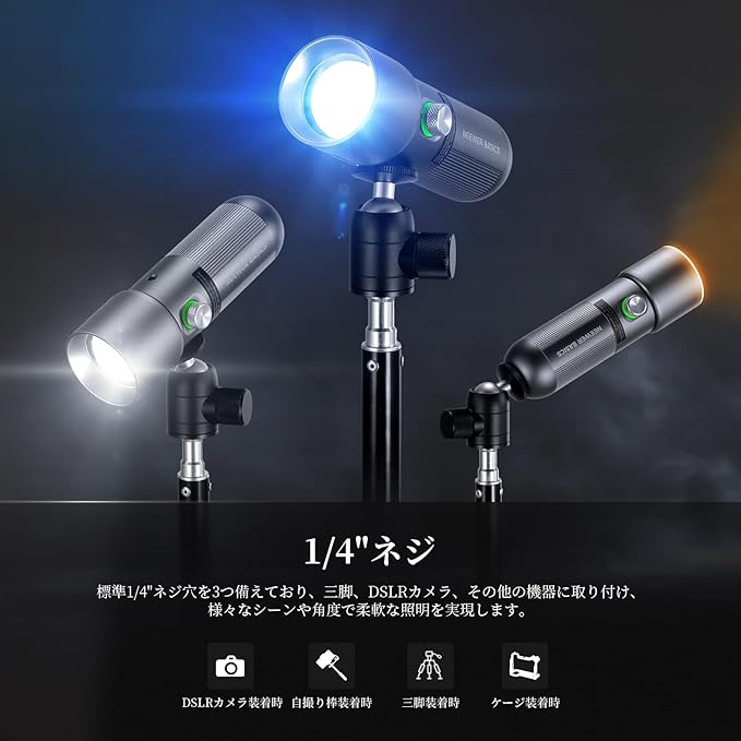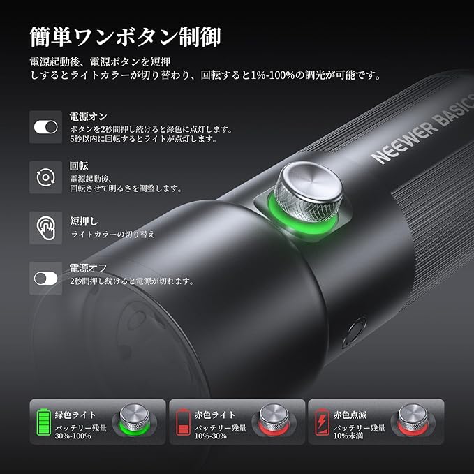 【ワンボタン制御&スマート.インジケーター】写真用フラッシュライトは便利なワンボタン制御設計を採用し、電源投入後、電源ボタンを短く押すだけで簡単にカラーを切り替えます。また、ボタンを回して明るさを1%-100%の範囲で調整も可能です。.残量を示すインジケーターライトも搭載しており、30%-100%で緑色に点灯、10%-30%で赤色に点灯、10%未満で赤色に点滅します。