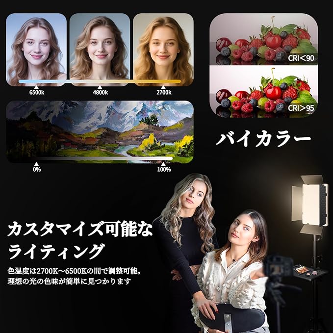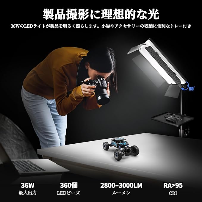 【高輝度&高演色のLED撮影用ライト】360個の高性能LEDビーズを搭載した36WのLED撮影ライトは、最大3000luxの明るさで安定した撮影照明を実現。色温度は2700K〜6500Kの間で自在に調整でき、明るさも0〜100%の無段階で調光可能。演色性CRI95+により肌の色や商品本来の色を忠実に再現でき、動画撮影、ポートレート、商品撮影、YouTube・TikTok撮影、ライブ配信などあらゆる撮影シーンに対応する撮影用ライトです。