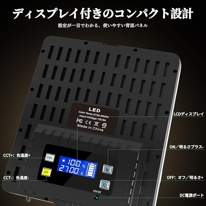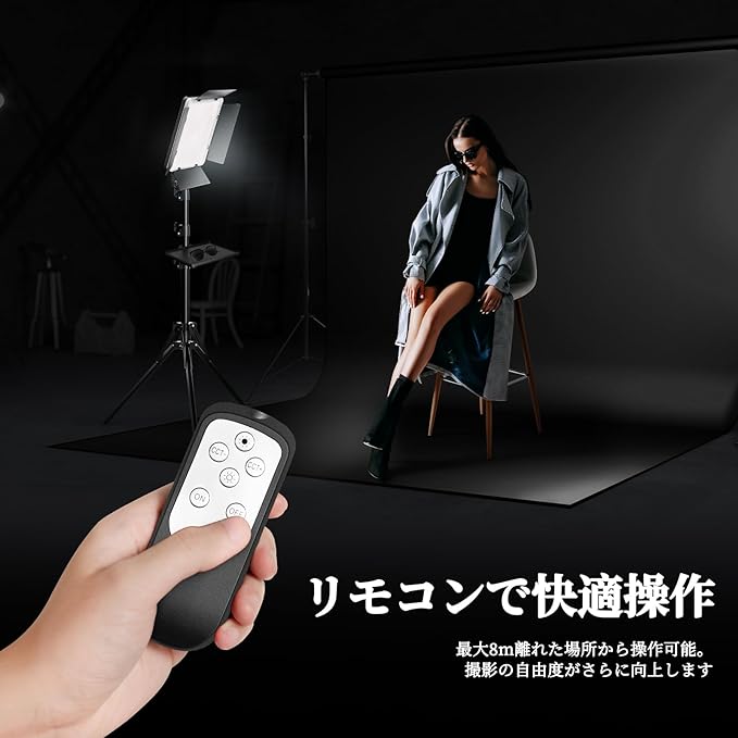【リモコン付き・リアルタイム表示で快適操作】付属の赤外線リモコンで、最大約8mの距離から明るさ・色温度を調整可能。手元にライトがない状況でも簡単に操作でき、撮影効率を大幅にアップします(※リモコン用の単4電池2本は別売りです)。また、背面の物理ボタンでも手動操作が可能。LEDディスプレイで現在の設定値がひと目で確認でき、撮影現場での迅速なライティング調整に役立ちます。