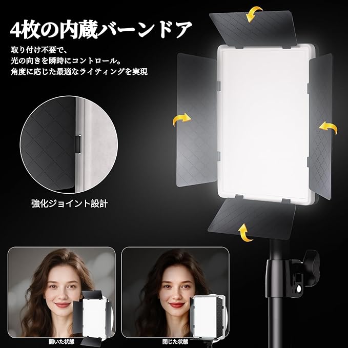 【内蔵型バーンドア搭載で光を自在にコントロール】4枚のバーンドアを本体に内蔵した独自設計で、工具不要・ワンタッチで開閉が可能。羽根は個別に調整でき、光の拡散を抑えながら必要な部分だけを明るく照らすなど、細かい光の演出が可能です。全開時にはソフトで自然なライティング、閉じると被写体にコントラストのある光を与え、印象的な雰囲気を演出。ポートレート撮影や商品撮影、映像制作に最適な撮影ライトです。