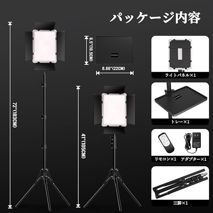 【充実したセット内容&万全のサポート体制】LED撮影ライト(バーンドア付き) 1、三脚スタンド 1、赤外線リモコン 1、トレイ 1、収納バッグ 1、12V/3Aアダプター 1、取扱説明書 1のフルセットでお届け。開封後すぐに使用可能。万が一商品に不具合やご質問があった場合も、専門スタッフが迅速に対応いたします。安心してご購入いただける高性能撮影用ライトキットです。