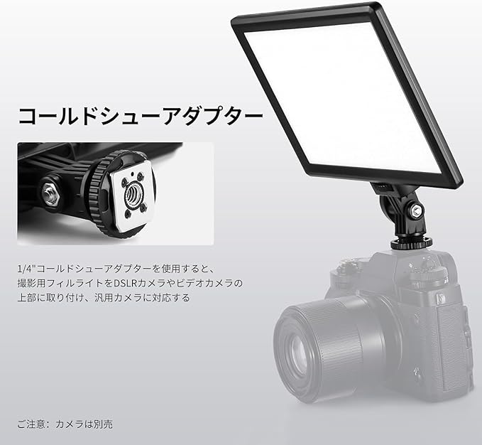 【コールドシューアダプターによる柔軟な取り付け】1/4"コールドシューアダプターにより、写真用フィルライトはDSLRカメラやビデオカメラの上部に取り付けられ、汎用カメラに対応し、前後に180 傾けて希望の撮影角度に調整できます。