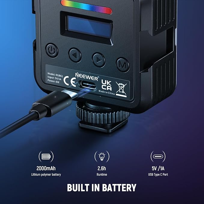 【小型軽量&プロ級光質表現】NEEWER RGB61撮影ライトは手のひらサイズのコンパクトボディ(80 66 30mm)で軽量(110g)設計で、屋外撮影でも手軽に携行できます。61個高輝度LED&6W高出力が最大800ルクス/0.5mを実現。CRI97+の高演色性により肌の質感を自然に再現。動画ブログ/Vログからポートレート、商品撮影まで、マルチシーン対応のプロ仕様照明ライト。