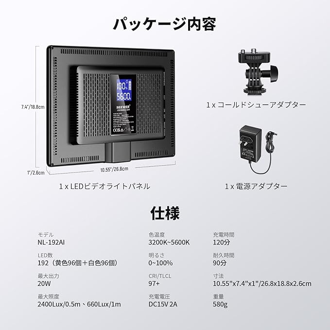 【セット内容&安心.】NL-192AI LEDビデオライト 1、調整可能コールドシューアダプター 1、JP充電器 1、ユーザーマニュアル 1。日本語取扱説明書も同梱していますので、ご安心ください。また、ご使用中何かご質問がございましたら、お気軽に.のカスタマーサポートまでお問い合わせください。