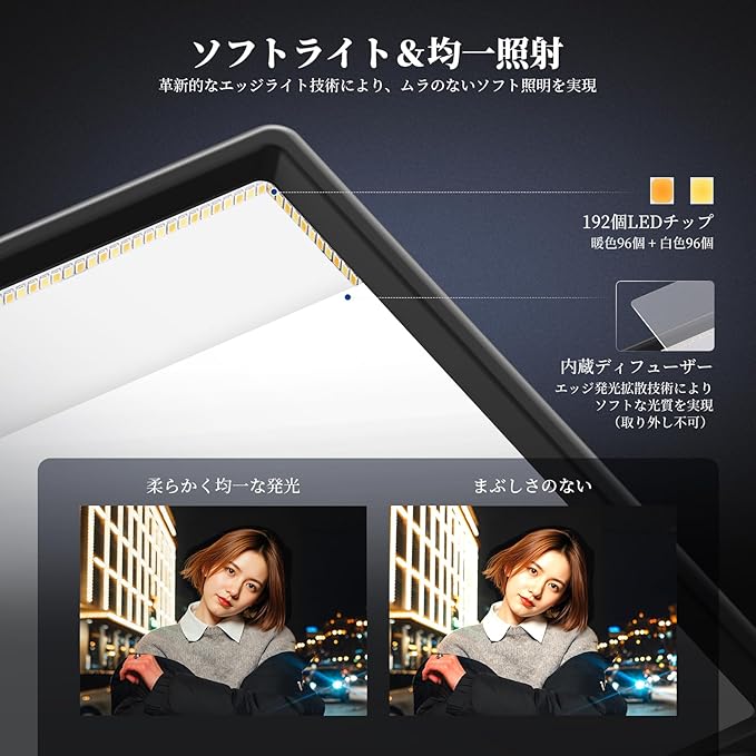 【プロ仕様の光質と直感的な操作】20Wバイカラービデオライトは、192個の高効率LEDチップ(暖色96個 + 白色96個)を搭載。調光範囲0~100%、色温度調整範囲3200K~5600K、CRI 97+を実現し、理想的な照明環境を提供します。最大照度は2400Lux(0.5m)、660Lux(1m)です。背面のLCDディスプレイで色温度・明るさ・.残量パーセンテージを一目で確認可能。放熱構造により安定動作を.し、プロフェッショナルな撮影環境をサポートします。