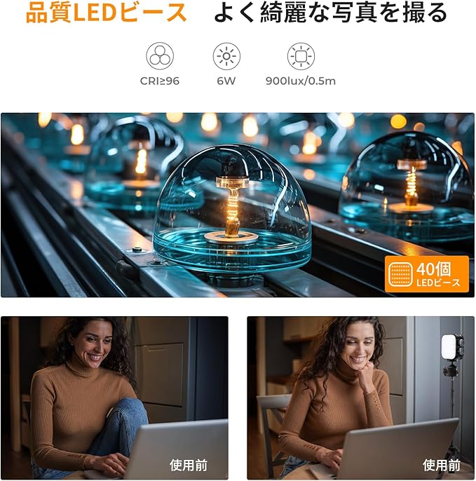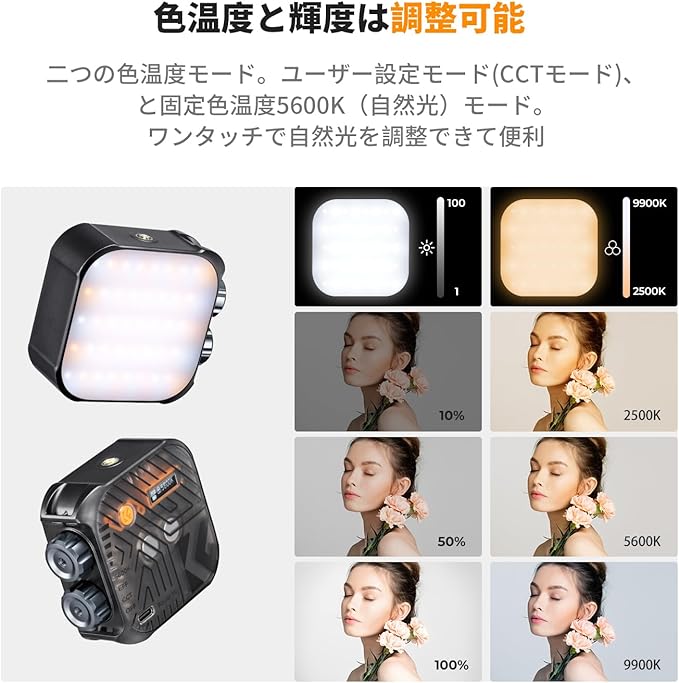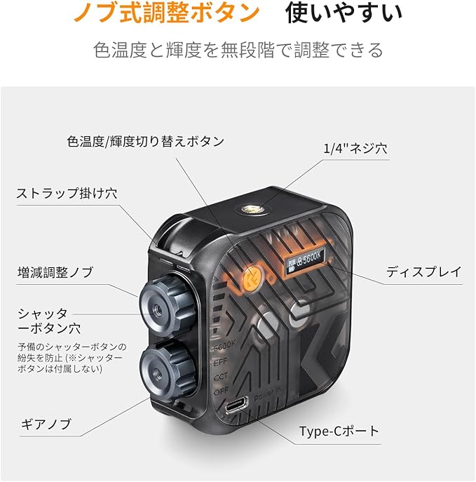 【ノブ式ボタン、繊細な調光を実現】無段階調整で、カメラマンの多くの撮影ニーズを満足でき、多様な環境での撮影に対応できます。2500K~9900Kの色温度は100K刻みで、1~100%の輝度は1%刻みで調整できてプロ級のカメラ用LEDライトです。
