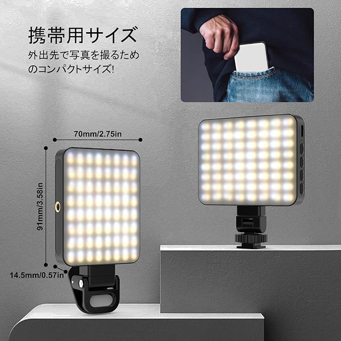 【コンパクトでポータブル】 私たちは、写真撮影用アクセサリーの利便性の重要性を理解しています。そのため、このスマホ用自撮りライトはより軽く、より薄く設計されており、サイズはわずか2.75x3.58x0.57inch(7cm*9.1xm*1.45cm (L*W*H)) です。持ち運びに便利なサイズで、ポケットやバッグに入れても場所を取らず、必要な時にいつでも最適な照明を確保できます。
