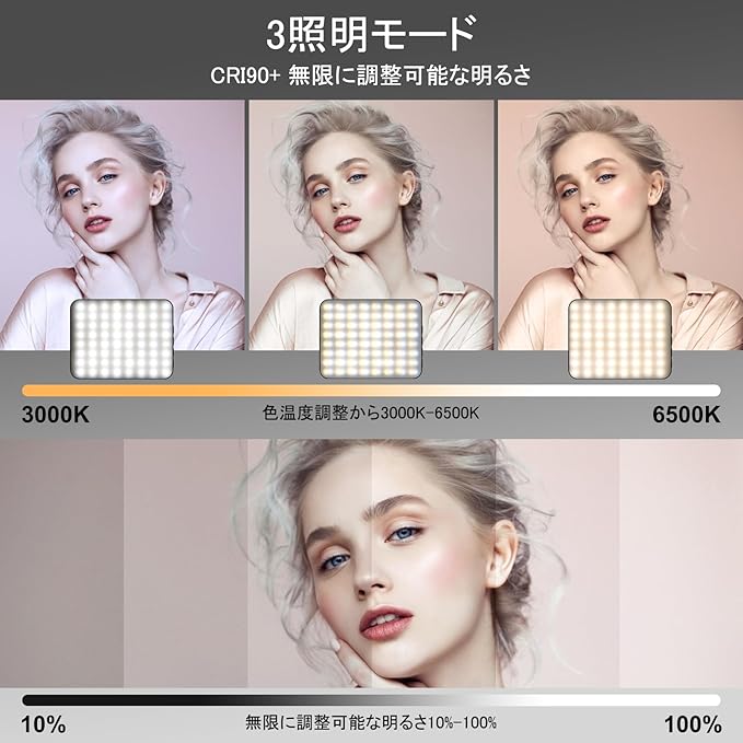 【128 LED自撮りライト】-128 LEDカメラライト(64冷光+64暖光),色温度3000K-6500Kの調整,明るくても眩しくない,3つのライトモード(暖かい光,暖かい光と冷たい光,暖かい光) 10段階の明るさ調整,あなたの照明要件を満たす.2000amhの大容量.を内蔵し、最大20時間の連続使用が可能です。
