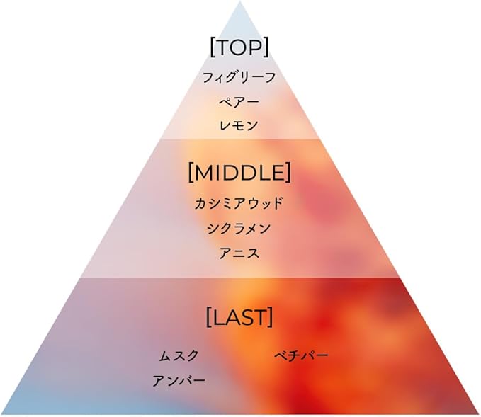 【トップ】: フィグリーフ, ペアー, レモン【ミドル】: カシミアウッド, シクラメン, アニス【ラスト】: ムスク, アンバー, ベチパー