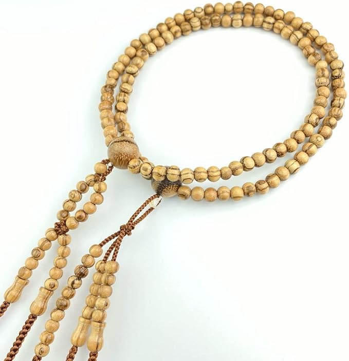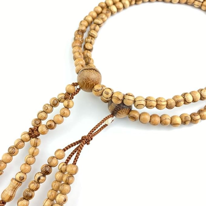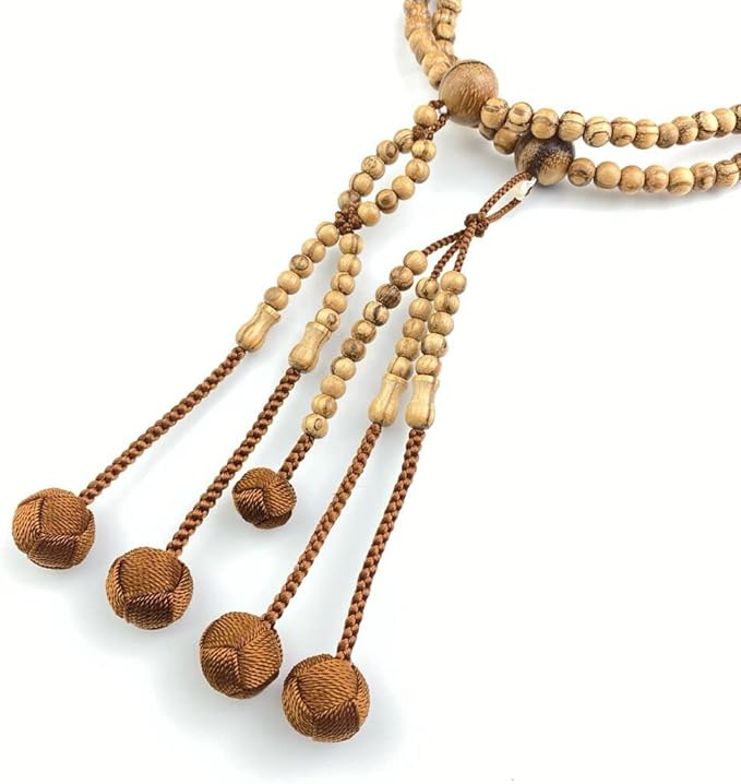 日蓮宗男性女性通用の木製数珠です、素材は虎纹木を採用しております。天然木を使用し、細かくて丁寧に研磨して加工します。虎纹木は虎の皮のような模様があるので虎纹木というが、この木目ははっきりしていて、木は硬く、しかも表面は繊細で数珠を作るのに適した材料です。房は、丈夫で扱い易く、型崩れを起こさない小田巻梵天房を採用させて頂きました。