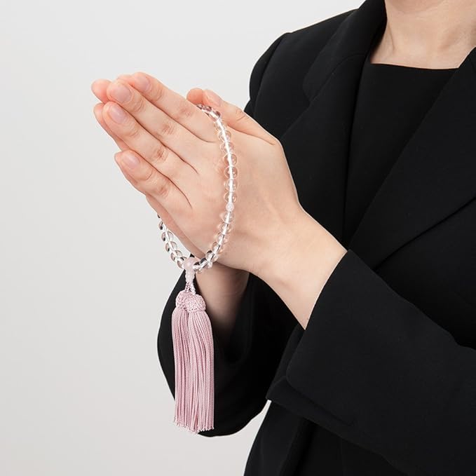 透明な美しい輝きを演出する本水晶を使用した女性用の念珠です。アクセントに淡いピンク色がかわいらしい、女性に大変人気のある紅水晶を使用しました。