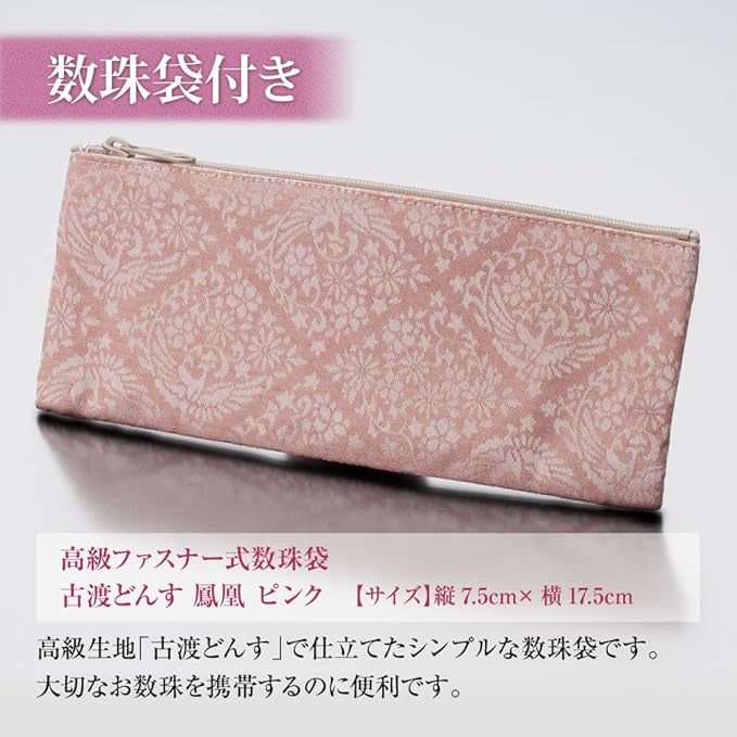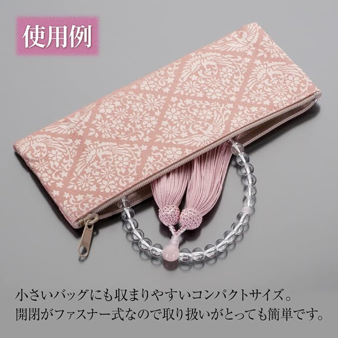 房は京都の伝統工芸である「京房ひも」の職人が製作した正絹頭付房を使用しております。小さいバッグにも収まりやすいコンパクトサイズの高級ファスナー式数珠袋をお付けします。