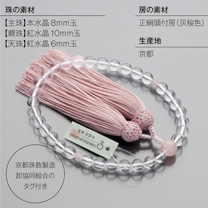 珠の素材:本水晶8mm玉/主珠…本水晶8mm玉/親珠…紅水晶10mm玉/天珠…紅水晶6mm玉/房の素材:正絹頭付房(灰桜色)/備考:高級ファスナー式数珠袋付き(縦7.5cm 横17.5cm)