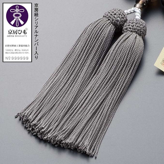 房は京都の伝統工芸である「京房ひも」の職人が製作した正絹頭付房を使用しております。京房ひも職人が作った証しであるシリアルナンバーをお付け致します。