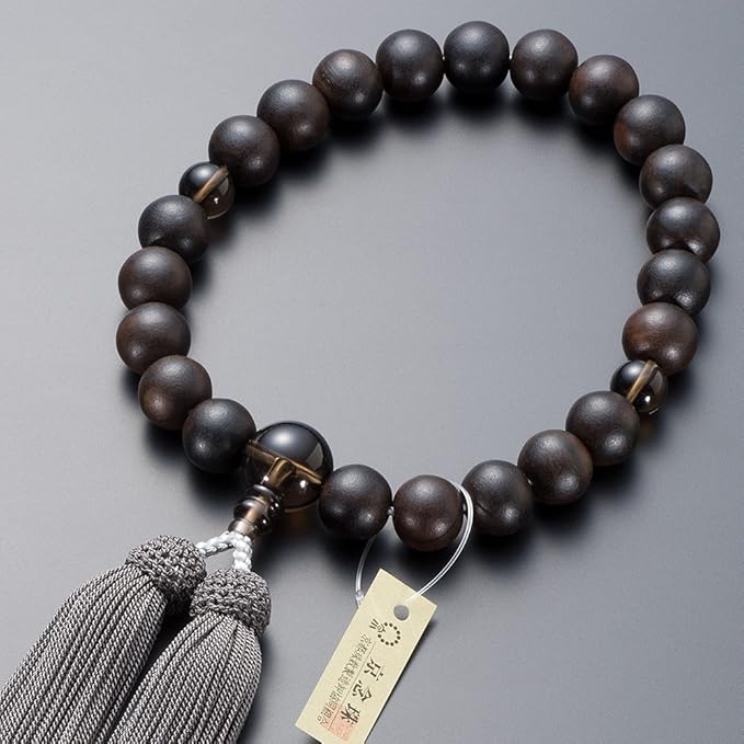 美しい木目が特徴的な銘木の縞黒檀を使用し、アクセントに茶色く透きとおった美しい茶水晶を使用した男性用の念珠です。