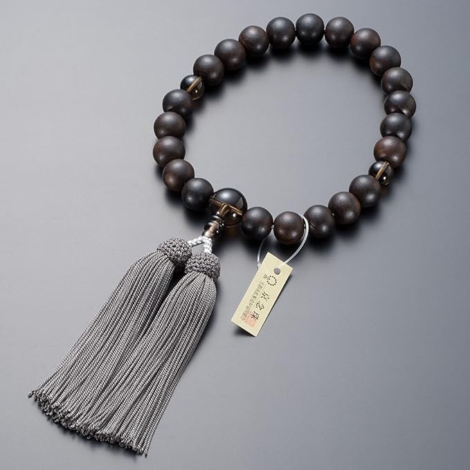 珠の素材:縞黒檀(艶消) 22玉/主珠…縞黒檀(艶消)13mm玉/親珠…茶水晶16mm玉/天珠…茶水晶10mm玉/房の素材:正絹頭付房(ねず茶色)/備考:数珠袋付き(縦10cm 横17cm)、数珠は桐箱入り