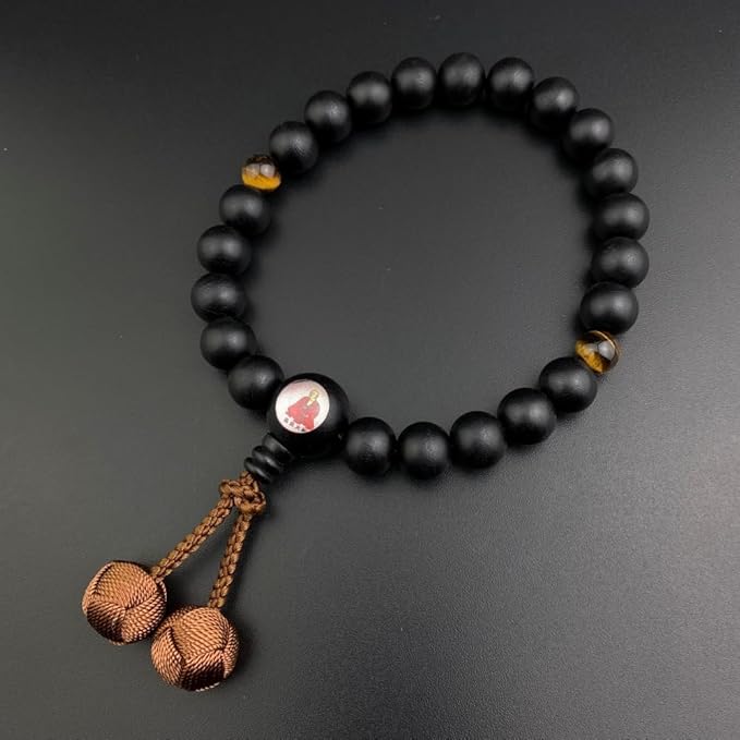 葬儀、お通夜、法事、お墓参りにて、すべての宗派のお客様にお使いいただける男性用の「略式数珠」でございます。素材は、艶消し加工の施された高級感ある黒檀と、人気の虎目石でございます。さらに親玉には、弘法大師画像入御尊像いれの珠を使用しております。房は、丈夫で扱い易く、型崩れを起こさない小田巻梵天房仕上がっております。