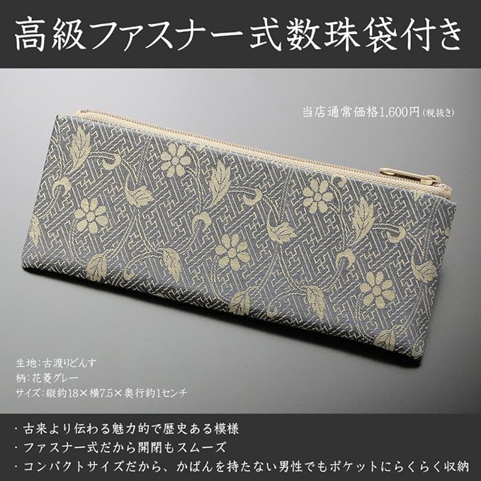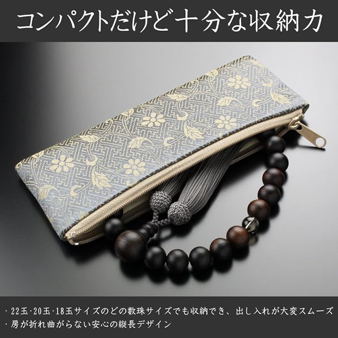 礼服の内ポケットに収納できる上質でコンパクトな高級ファスナー式数珠袋がセットになっているので、届いた直ぐにお持ちいただけます。