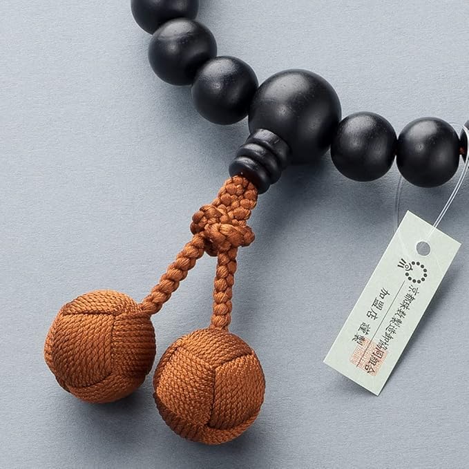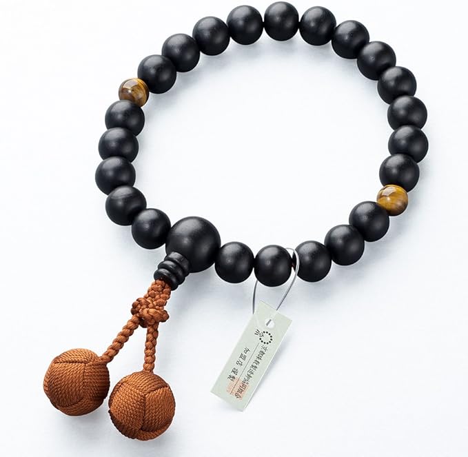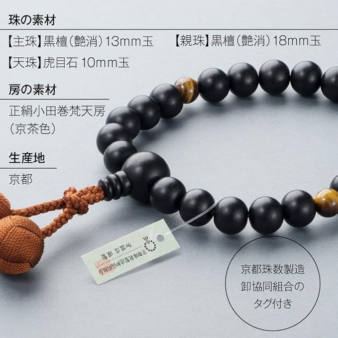珠の素材:黒檀(艶消)22玉/主珠…黒檀(艶消)13mm玉/親珠…黒檀(艶消)18mm玉/天珠…虎目石10mm玉/房の素材:正絹小田巻梵天房(京茶色)/備考:数珠袋付き(縦18cm 横7.5cm)