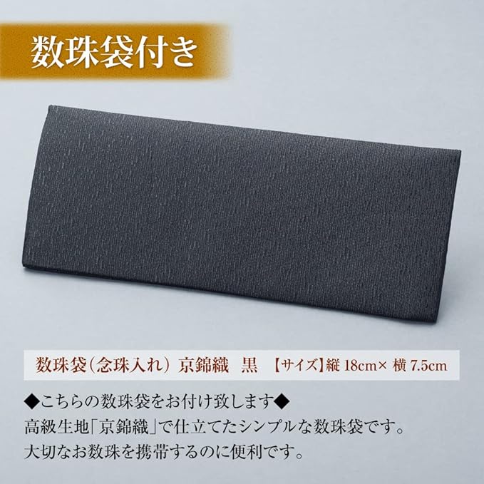 伝統ある「京念珠」だけが付けることを許される京都珠数製造卸協同組合のタグ付き。京都の数珠職人が匠の技で仕立てた逸品でございます。滝田商店ブランド品質の証である滝田商店発行「京念珠製造師製作証明書」付き。