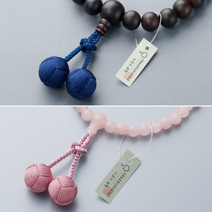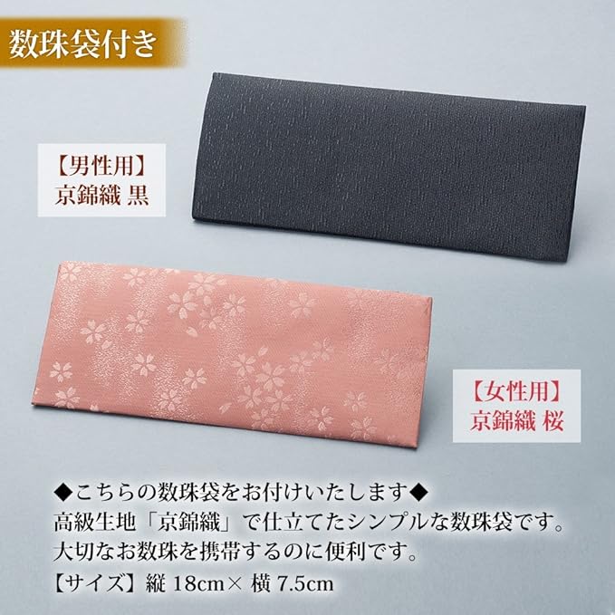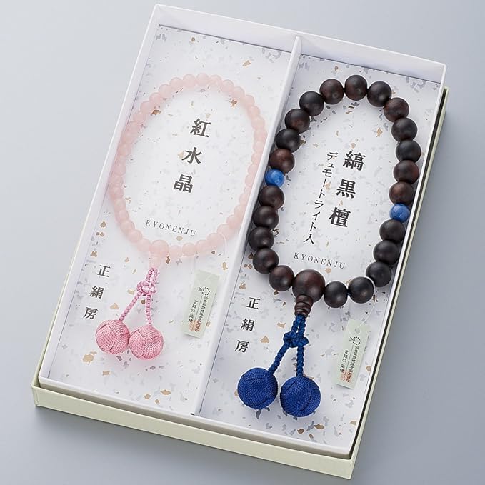 仏壇屋 滝田商店 数珠セット 【 ペア数珠 】 数珠 男性用(縞黒檀 2天デュモートライト 22玉 正絹房)/数珠 女性用(紅水晶 7mm玉 正絹房) 【 数珠袋付き 】すべての宗派でお使いいただける 男女セット 念珠 京都製 【滝田商店発行 京念珠製造師製作証明書付】 | oioioichan