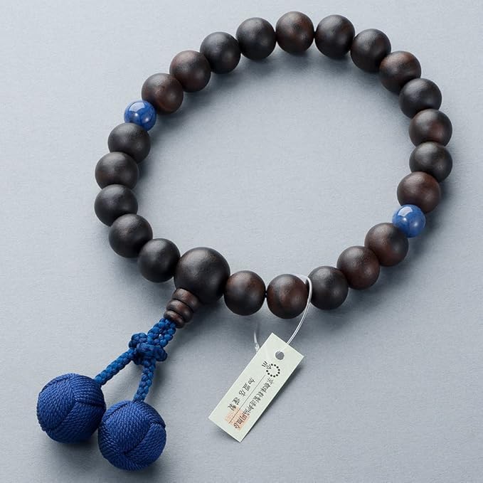 【男性用】 珠の素材:縞黒檀(艶消)22玉/主珠…縞黒檀(艶消)13mm玉/親珠…縞黒檀(艶消)18mm玉/天珠…デュモートライト10mm玉/房の素材:正絹小田巻梵天房(鉄紺色)/備考:数珠袋付き(縦18cm 横7.5cm)