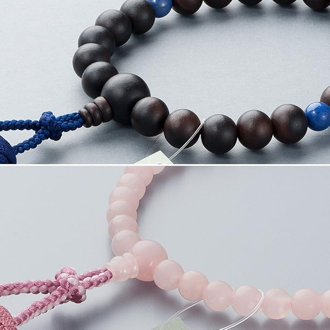 美しい木目が特徴的な銘木の縞黒檀に、深みのある上品な藍色が美しいデュモートライトを組み合わせた男性用の数珠と、淡いピンク色が可愛らしい天然石の紅水晶を使用した女性用の数珠をセットにした、お得なペア数珠です。ペア専用紙箱に入れてお届けします。