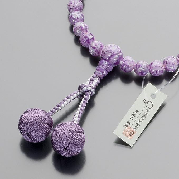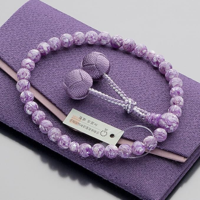 マーブル模様が美しいラベンダーシェルを使用した女性用の念珠です。ラベンダーシェルは「紫貝(むらさきがい)」という貝を特殊な加工で仕上げた玉で、他の数珠とは一味違う、かわいらしくオシャレな雰囲気があります。表情豊かな美しい艶めきで、上品な印象を演出してくれます。