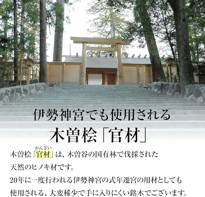 日本三大美林の一つである木曽桧「官材(かんざい)」に、「光明真言(こうみょうしんごん)」を彫り込んだ腕輪念珠(ブレスレット)です。木曽桧「官材」は、伊勢神宮の式年遷宮の用材としても使用される、国有林で伐採された天然のヒノキ材です。清潔感のある上品な木目と滑らかな手触りが特徴で、使い込むほどに深い質感のある色艶に変化していきます。