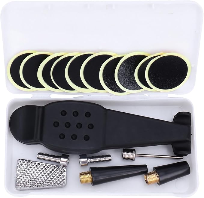「粘着剤不要のパッチ」接着剤不要でタイヤを修復することができます。やすりを使って、タイヤの穴あき部分にパッチをしっかりと貼り付けてOK!