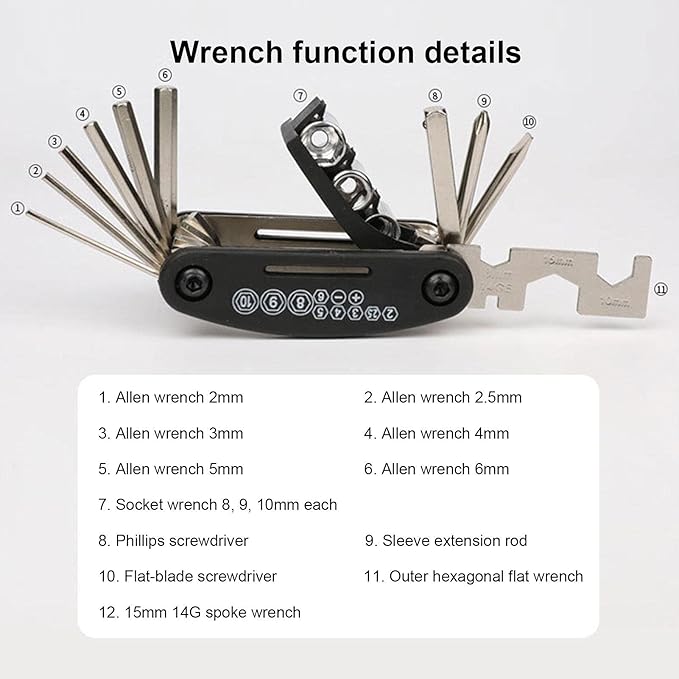 【高品質素材】高品質のステンレス鋼で作られた、頑丈で耐久性のある12-in-1多機能ツールレンチ。折り畳み式のデザイン、高強度、メンテナンスが楽勝~