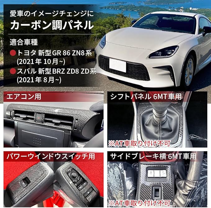 【種類】センターダクトパネル、シフトパネル(6MT車用)、パワーウインドウスイッチ左右セット、サイドブレーキ(横6MT車用) 【適合車種】トヨタ 新型GR 86 ZN8系(2021年10月~)、スバル 新型BRZ ZD8 ZD系(2021年8月~) 【注意】説明書は付属していません。輸入品ですので外箱に傷、へこみがある場合がございます。