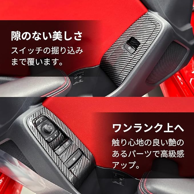 日々の運転で必ず手で触れるスイッチやレバーの周りにカバーを取り付けることで、内装を摩擦や劣化から守ることができます。見た目の美しさだけでなく、愛車を傷や汚れから保護するという実用性を兼ね備えています。貼り付けたパーツを剥がす際はドライヤーやヒートガンで温めると粘着テープの接着剤が柔らかくなり、剥がしやすくなります。シール剥がしなどの薬品を使用する場合は内装の変色にご注意ください。