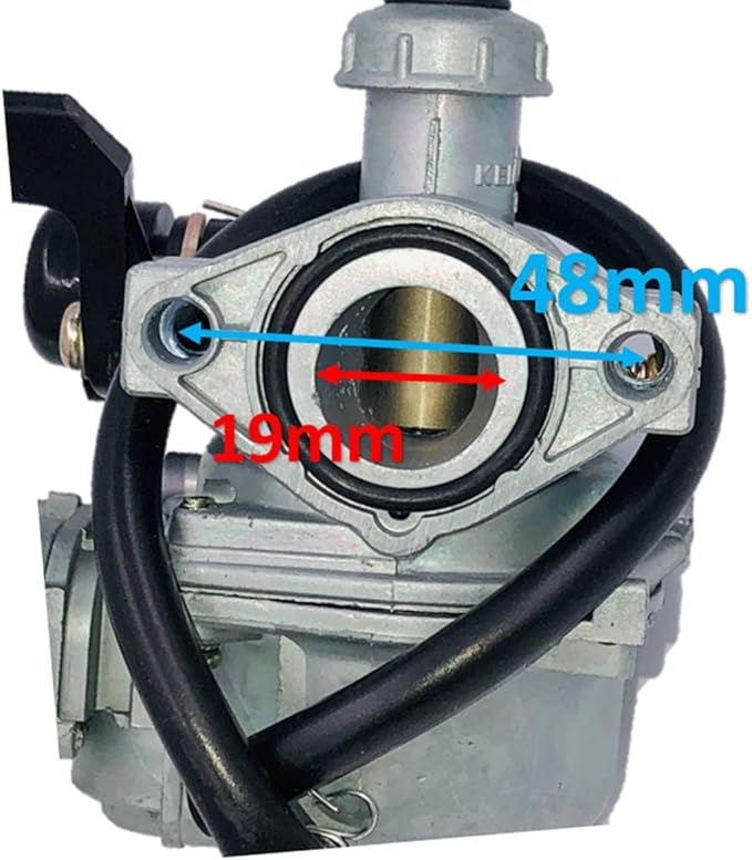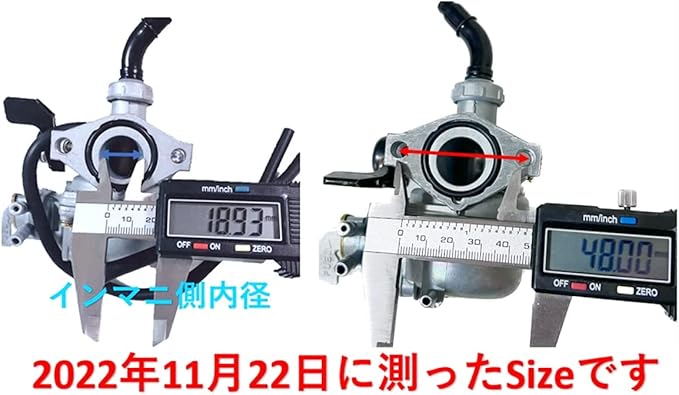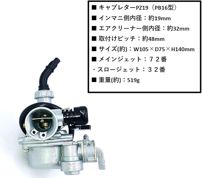 ■ インマニ側内径:約19mm ■ エアクリーナー側内径:約32mm ■ 取付けピッチ:約48mm ■ サイズ(約):W105 D75 H140mm ■ メインジェット:72番 スロージェット:32番 ■ 重量(約):519g