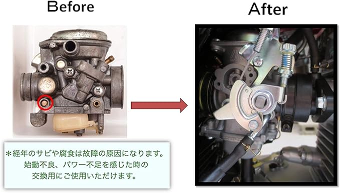 ✅■経年の劣化による錆や腐食は目に直接見えないためかなり進行しています。 ■それはトルクの減少・アイドリングの不安定・燃費の悪さの原因かもしれません。経年のサビや腐食は故障の原因になります。 ■始動不良、パワー不足を感じた時の交換用にご使用いただけます。キャブレター内部を清掃してご使用ください。 ■必要なパーツはいずれ生産が中止され入手困難になりますので、入手できるうちにストックしておくことをお勧めします。 ■交換用としてストック/保管しておくことをお勧めします。 ※入荷時期・ロットによって多少、仕様・デザインが変わる場合がございます。あらかじめご了承ください。 ※ディスプレイ等の環境により、画像と色合い等が異なる場合多少あるかと思います。ご了承ください。 ※取り付けについて不安な方は専門のショップや業者へのご依頼をお願い致します。 ※他機種に流用の場合は、自己責任で取り付けてください。取付穴の位置やスロットルワイヤーの取り回しなどに注意を払ってください。