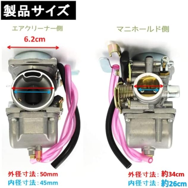 ✅【 口径サイズ 】 マニホールド側 (外径) 34mm (内径) 26mm / エアクリーナー側 (外径) 50mm (内径) 45mm 【キャブ 番手】 メインジェット #125 スロージェット #35【 重量 】 665g 【 全体size 】縦: 約14cm 横 : 約11 cm 【 ホース長さ 】約 34.8cm