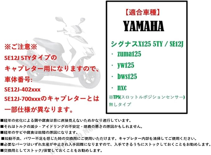 ✅ 【適合車種】 YAMAHA 用(ヤマハ 用) キャブレター ※TPS(スロットルポジションセンサー)無しタイプ ・ シグナスX125 5TY / SE12J ・ zuma125 ・ yw125 ・ bws125 ・ nxc ※ SE12J 5TYタイプのキャブレター用になりますので、 車体番号: SE12J-402xxx SE12J-700xxxのキャブレターとは 一部仕様が異なります。