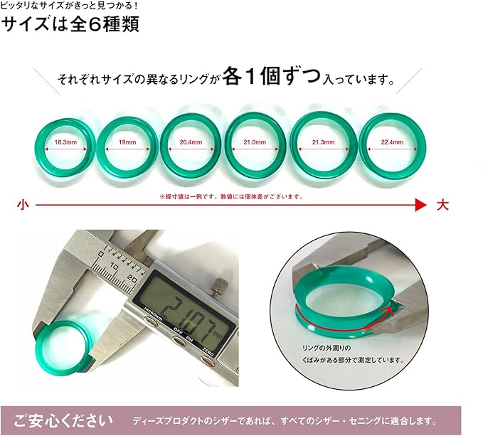 サイズは全部で6種類 1個ずつ 18.5〜22mmリング 各1個ずつ 計6個入り