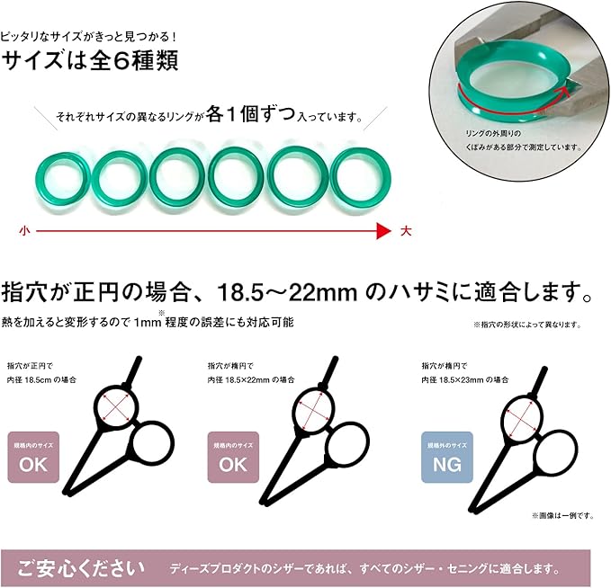 3サイズの6個入。 ■ Sサイズ:約22mm(内寸 約18mm) ■ Mサイズ:約23mm(内寸 約19mm) ■ Lサイズ: 約24mm(内寸 約20mm)