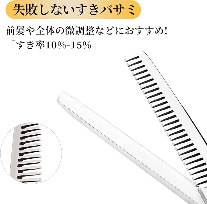 【失敗しないすきバサミ】セニングのスキ率は10%-15%前後と使いやすく、カットラインが出にくいので初心者の方にも安心してお使い頂けます.