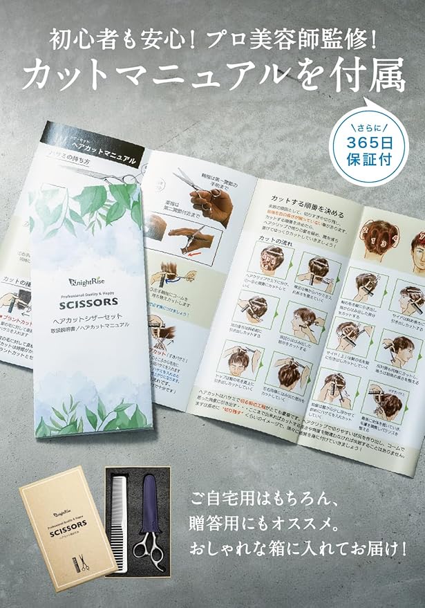 【商品内容】 「カットハサミ、ハサミケース、調節器具、コーム、掃除布、ヘアカットマニュアル」計6点をオリジナルパッケージにお入れしてお届け致します。 カットハサミは調整しておりますのですぐにお使いいただけます。