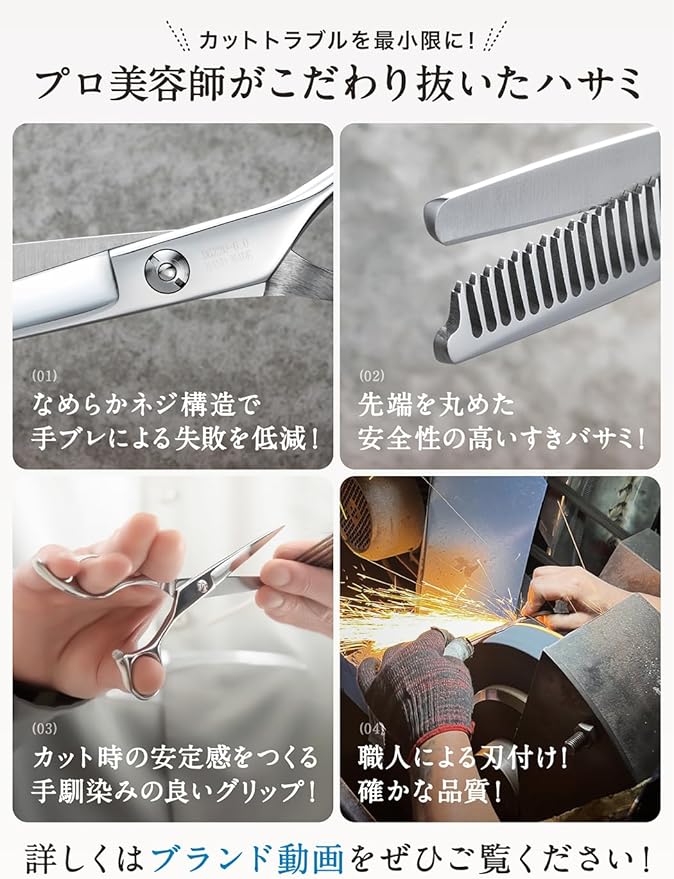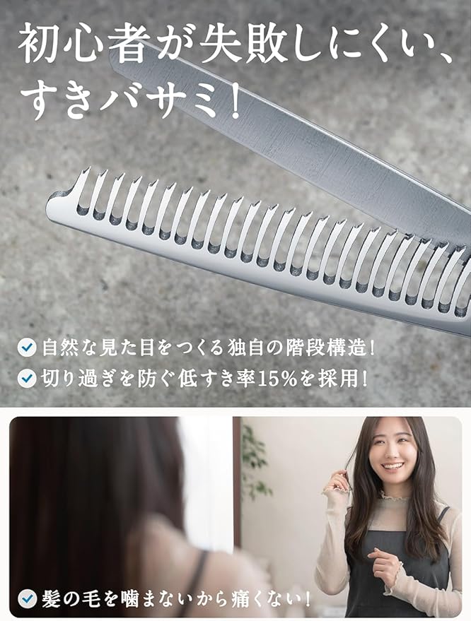 【商品仕様】一般的なすきバサミはすき率25%以上ですが、こちらはすき率15%。すき率を抑える事によって、切りすぎることなく初心者の方でも失敗するリスクを抑え、自然に仕上げることができます。
