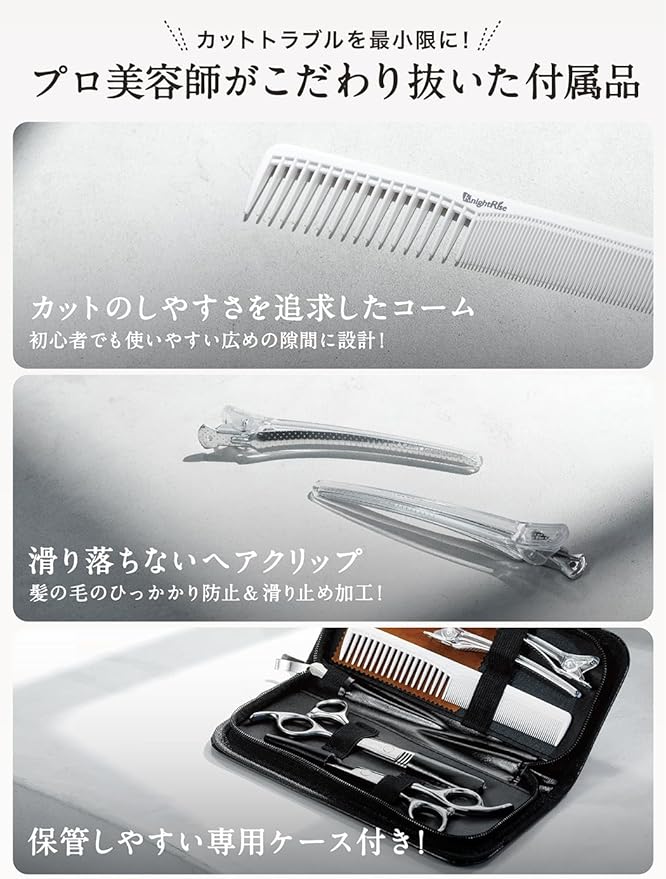 【プロ美容師が徹底監修】 ナイトライズのシザーセットはプロ美容師との共同開発により、握りやすさや刃の形状、重心バランスまで細部にこだわり、コーム、ヘアクリップ、シザーケースなどセット内容全てに最適な道具を揃えました。細かい改良を繰り返して完成したこだわりのセット内容になっております。