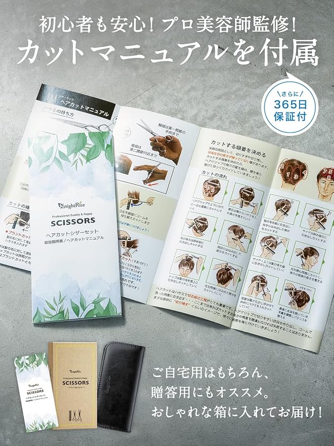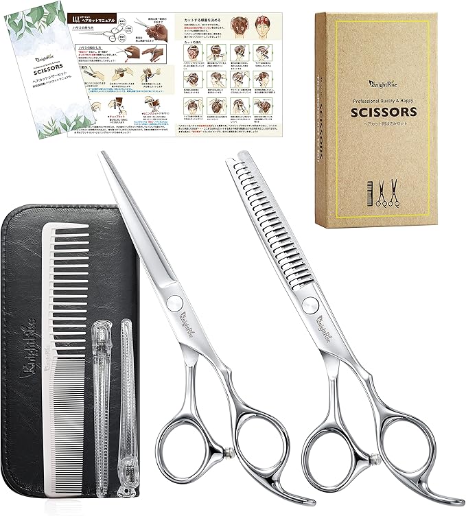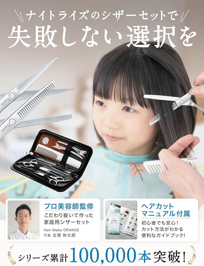 【商品内容】 「カットハサミ、すきバサミ、調節器具、コーム、ヘアクリップ(2個)、掃除布、専用ケース」計7点に、ヘアカットマニュアルをお付けして、オリジナルパッケージに入れてお届け致します。 ハサミは調整しておりますのですぐにお使いいただけます。