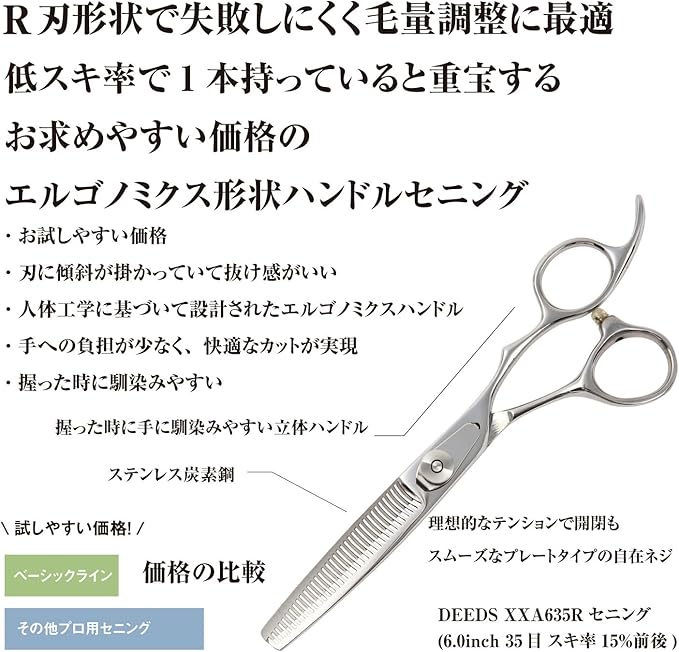 エルゴノミクス形状の立体型ハンドルとフラットな刃先とR刃形状で抜け感の良いセニングです。
