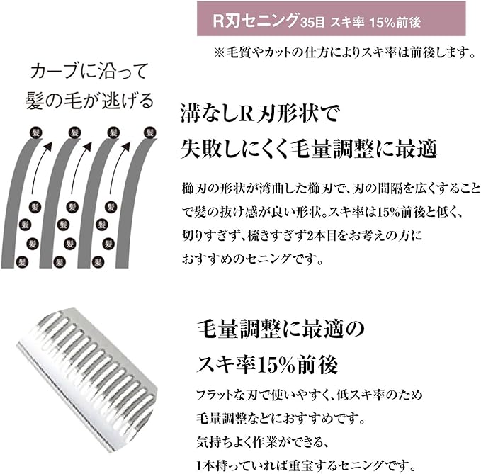 フラット刃とR刃形状で抜け感が良く、毛量調節に最適